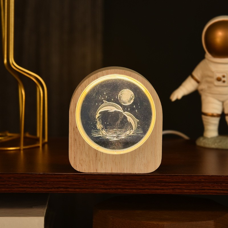 Este es un velador o lámpara de noche de cristal 3D con base de madera.