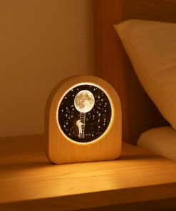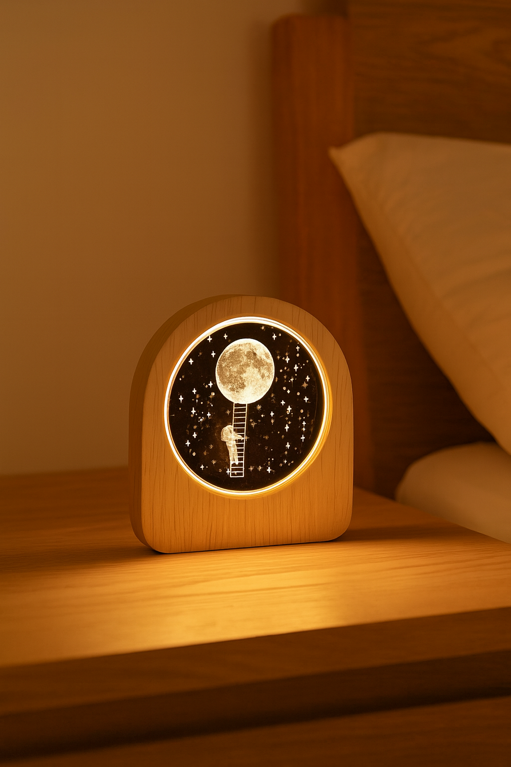Este es un velador o lámpara de noche de cristal 3D con base de madera.